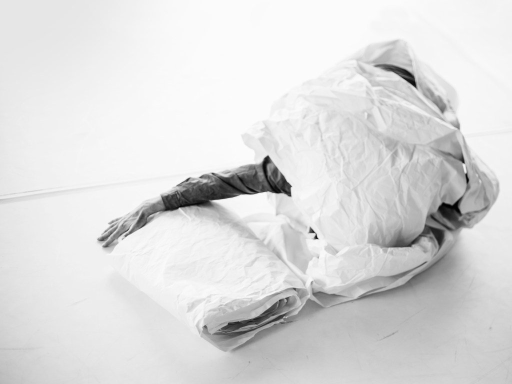 The long durational performance installation unfolds the story of two dancers who have never met physically upon rolls on rolls of paper and over five hours.